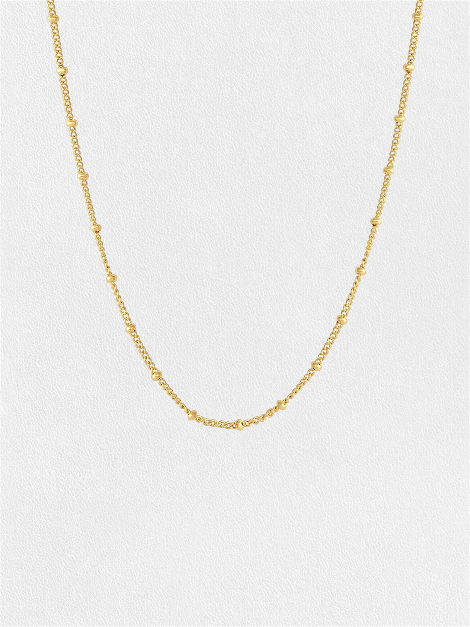 Meet Polène- our perfect basic necklace. This dainty chain adorned with delicate spheres will become your everyday go-to for effortless style. Versatile and perfect for layering, it is a key piece to add a touch of chic simplicity to any look.